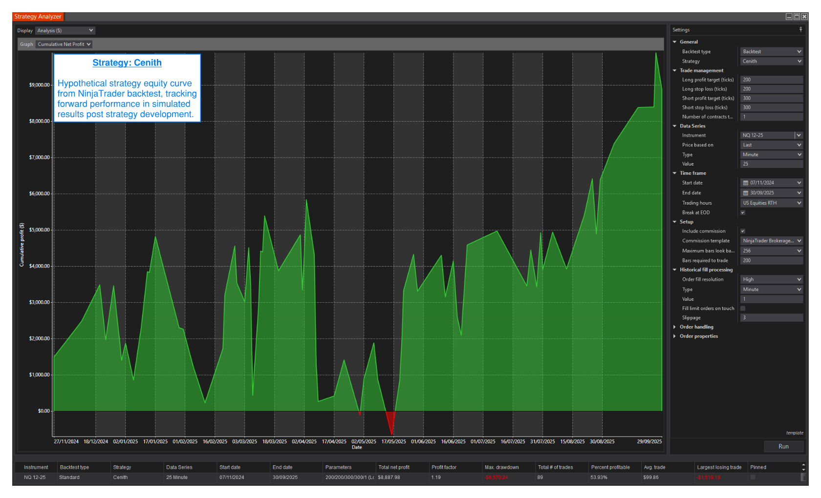 Cenith is a precision breakout and momentum system tailored for NQ / MNQ on the 25-minute chart. It’s built to identify directional continuation through volatility compression zones, combining Keltner Channel dynamics with adaptive moving averages to isolate clean, low-noise entries. By aligning volatility expansion with structural strength, Cenith seeks to capture intraday impulses where price transitions sharply from balance to breakout.