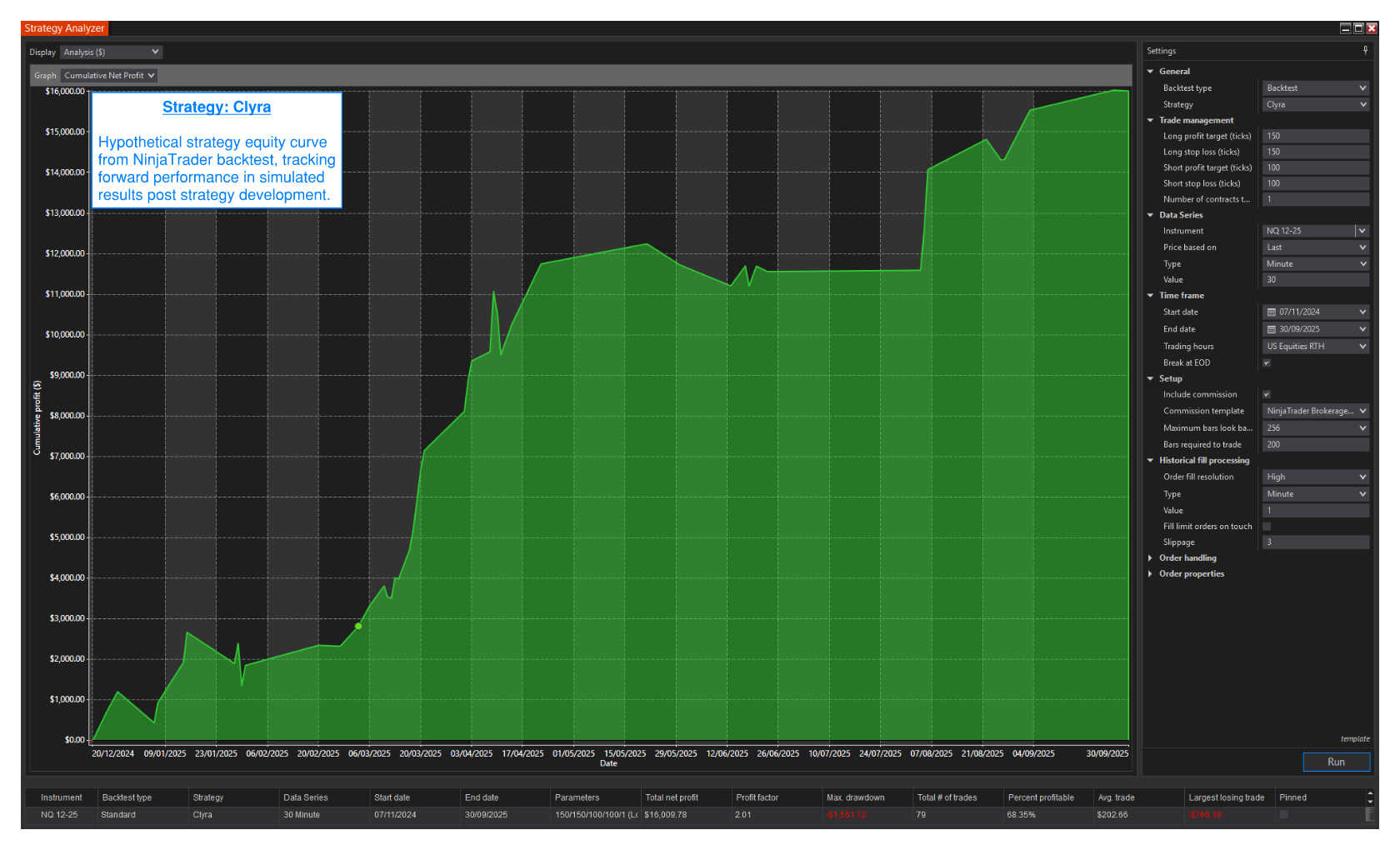 Each position is governed by fixed profit and stop parameters, providing clear, repeatable risk control. Long trades emerge from volatility breakouts near the 200-period average, while short setups engage after momentum exhaustion confirmed by RSI shifts and trend alignment. This blend of volatility logic and momentum reversal analysis allows Clyra to adapt to the high-velocity behavior of Nasdaq futures without relying on over-optimized indicators.