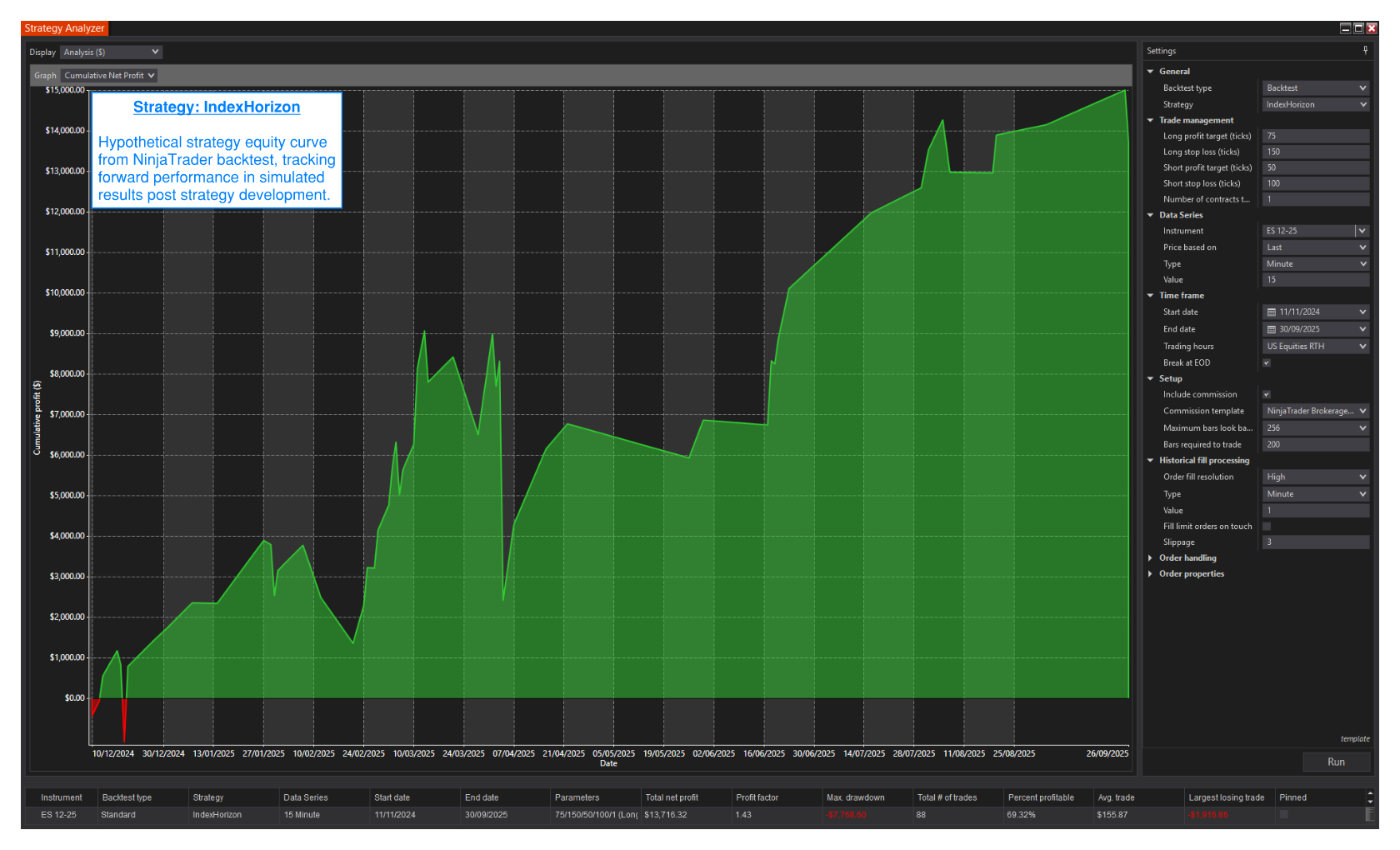 IndexHorizon is a structured mean-reversion and breakout system built for ES / MES on the 15-minute chart. It identifies oversold exhaustion and rejection points in the S&P’s intraday structure, combining WaveTrend momentum shifts with layered moving average analysis. By integrating short-term reversion logic with controlled breakout confirmation, IndexHorizon captures both sides of market behavior — steady recoveries and directional fades — within a single cohesive framework.