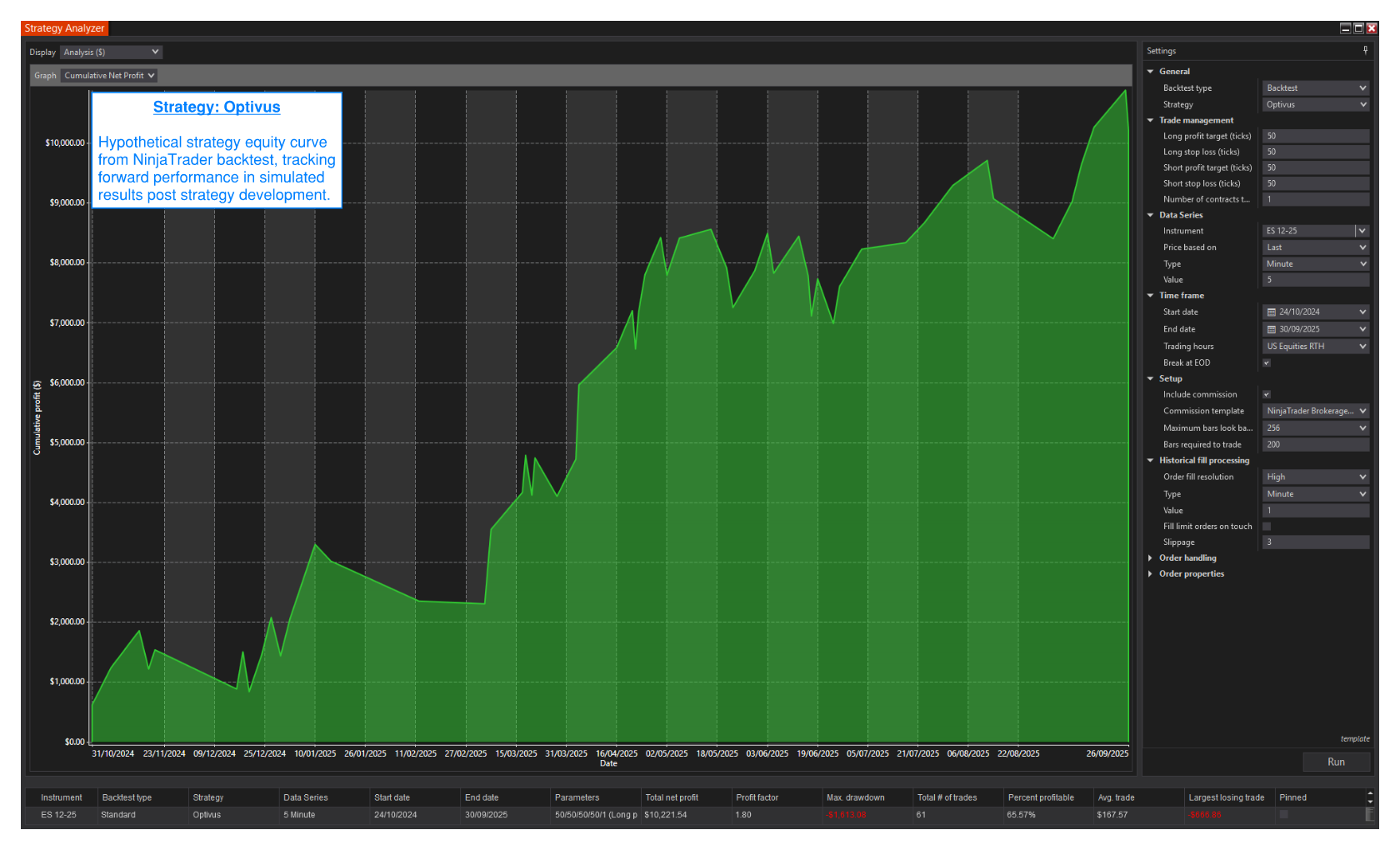 Optivus is a compact breakout system engineered for ES / MES on the 5-minute chart. Built for precision and speed, it identifies short-term structural shifts using volatility thresholds and ZigZag-based confirmation to capture micro breakouts within the S&P’s intraday rhythm. The system thrives in environments where price compresses and then expands sharply, entering clean directional moves with tight, symmetric bracket control.