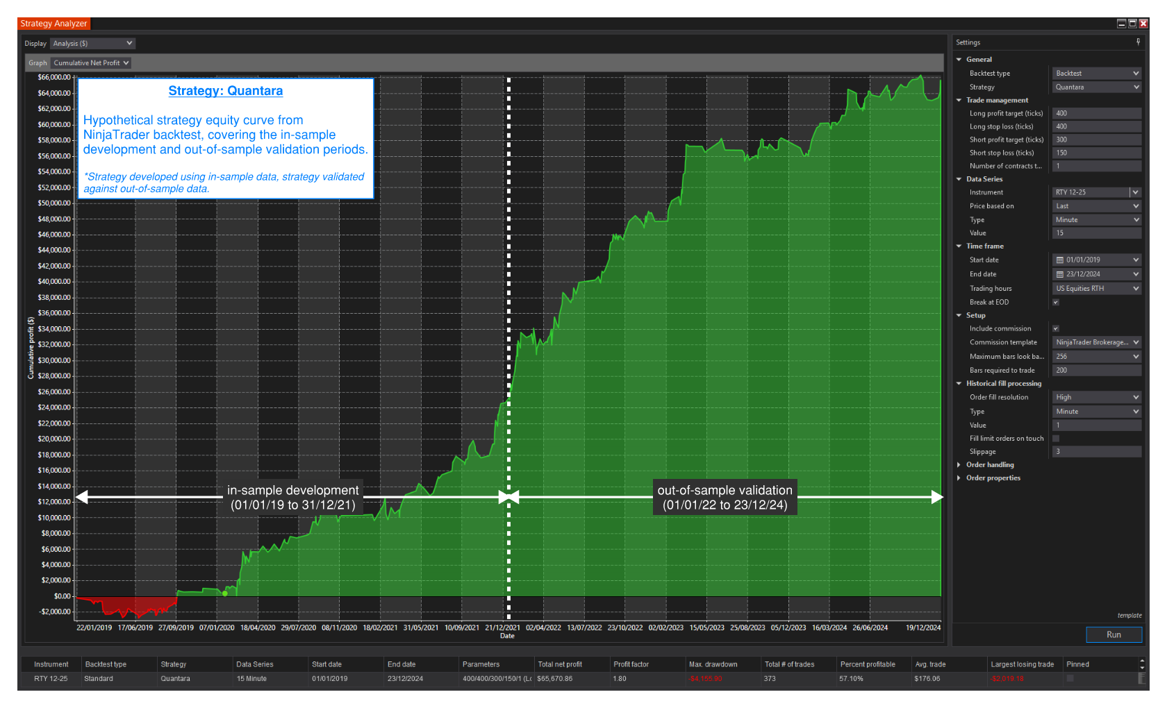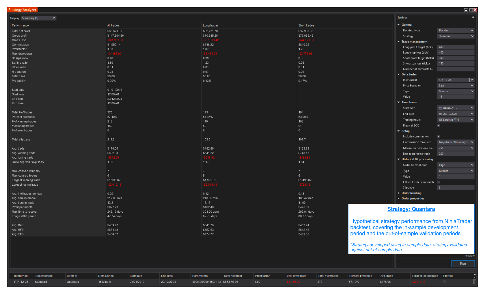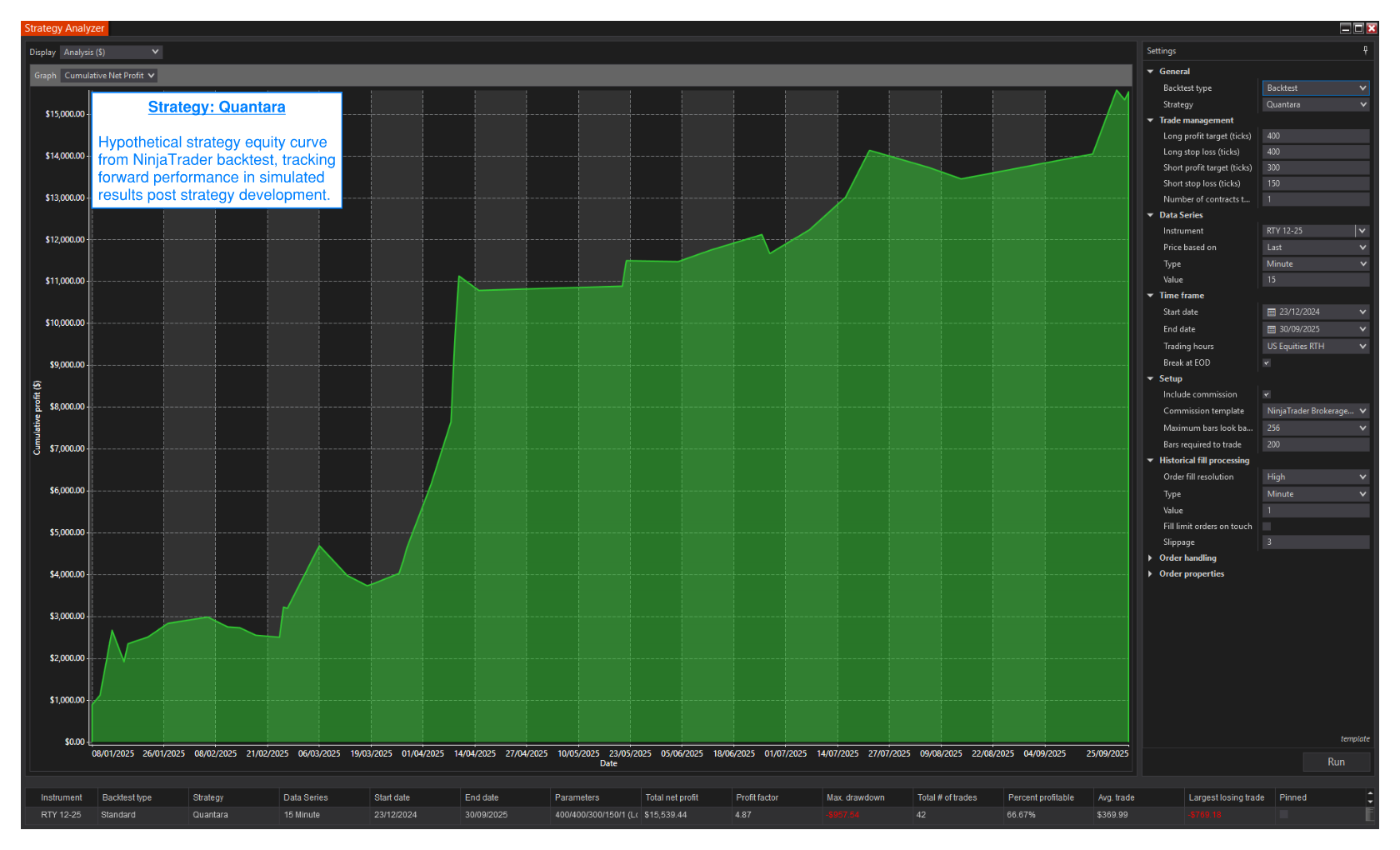 Quantara is a precision-engineered mean-reversion and trend-following system designed for RTY / M2K on the 15-minute chart. Built around the Russell’s dynamic intraday rhythm, it integrates momentum exhaustion with structural confirmation to identify high-probability reversal and continuation points. The strategy thrives on the Russell’s tendency to overextend and correct sharply, offering balanced exposure to both reactive and directional setups.