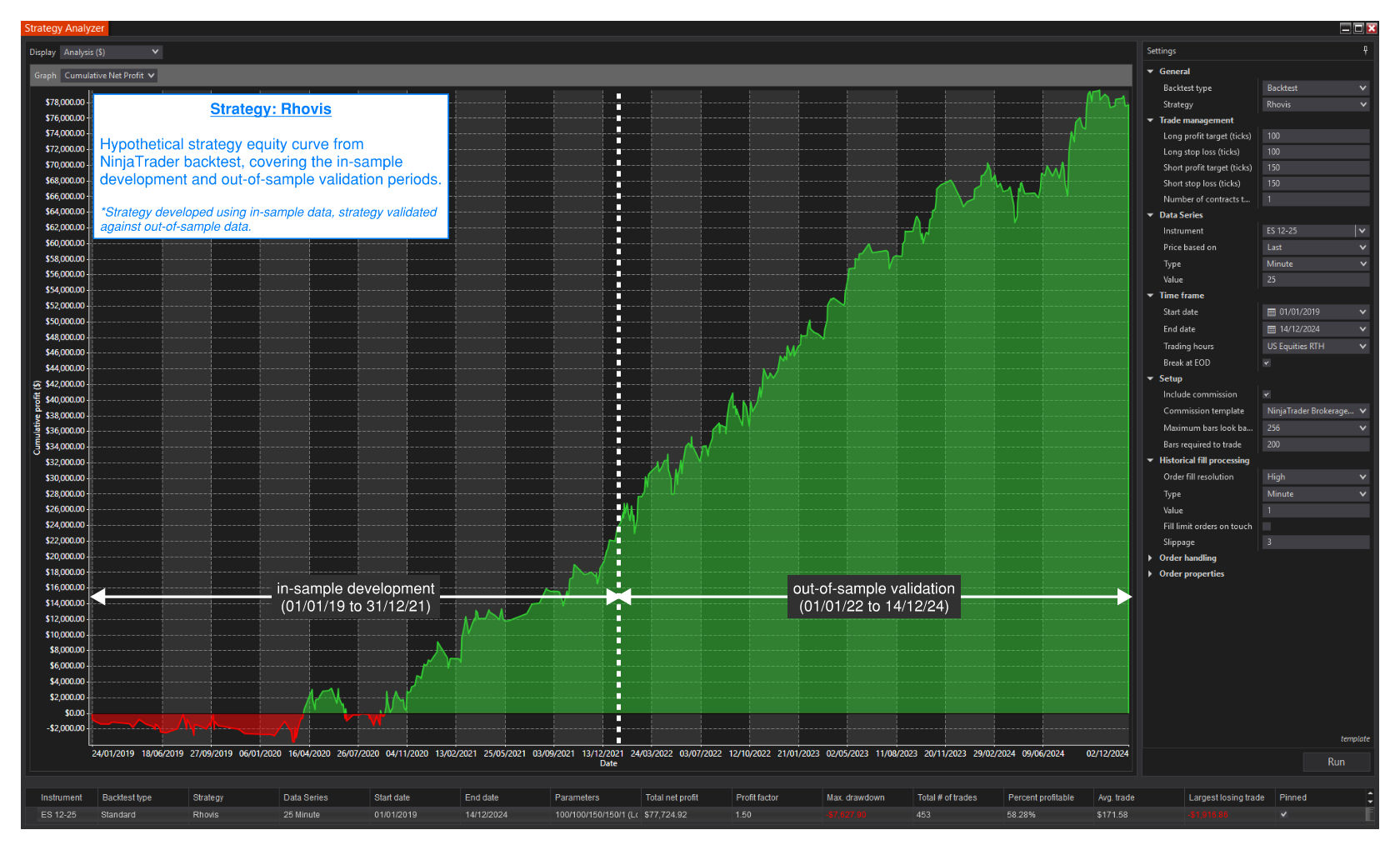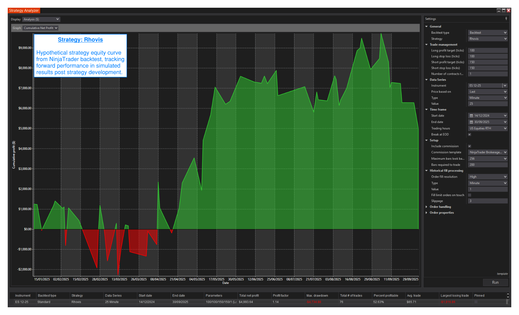 Rhovis is a disciplined trend and breakout system developed for ES / MES on the 25-minute chart. It’s designed to capture directional movement as momentum and volatility align, using layered confirmations from ADX, Choppiness Index, and ZLEMA structure. By filtering entries through both trend strength and volatility expansion, Rhovis focuses on clean, high-probability setups while maintaining fully automated trade control with predefined stop and profit brackets.
