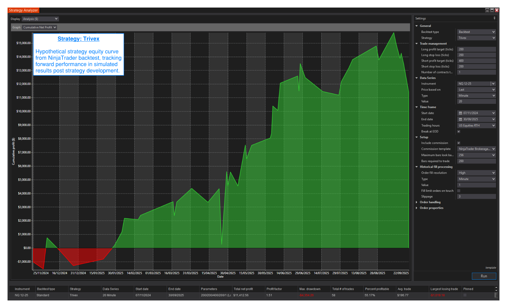 Trivex is a dual-phase trading system developed for NQ / MNQ on the 20-minute chart, blending mean-reversion precision with trend-following discipline. It detects shifts in price behavior around volatility midpoints and adaptive averages, using Bollinger and WaveTrend dynamics to capture both reversals from compression and extensions in trending phases. This balance allows Trivex to participate in two distinct but complementary market environments without curve-fitting or over-complication.